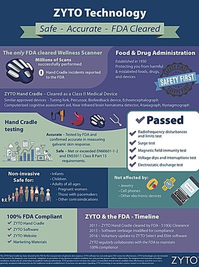 You will place your hand on a cradle. The device sends small electrical currents (that are generally not felt by the user) through the body to measure the body's galvanic skin response, similar to technology used in lie detector tests (this is non-invasive and painless). The scan runs through a series of virtual "stressors" or digital signatures representative of various physical and environmental factors to see how the body responds to each. The idea is that the body will have a different galvanic skin response to stressors it is in harmony with versus those it is not. Based on these responses, the Zyto software generates a report that indicates the body's preferences, imbalances, or sensitivities. This scan gives us a comprehensive snapshot of your internal terrain, which can be invaluable for pinpointing potential areas which could be in need of support. NOTE: ***This is NOT a diagnostic tool*** Always consult with your physician and follow their advice.